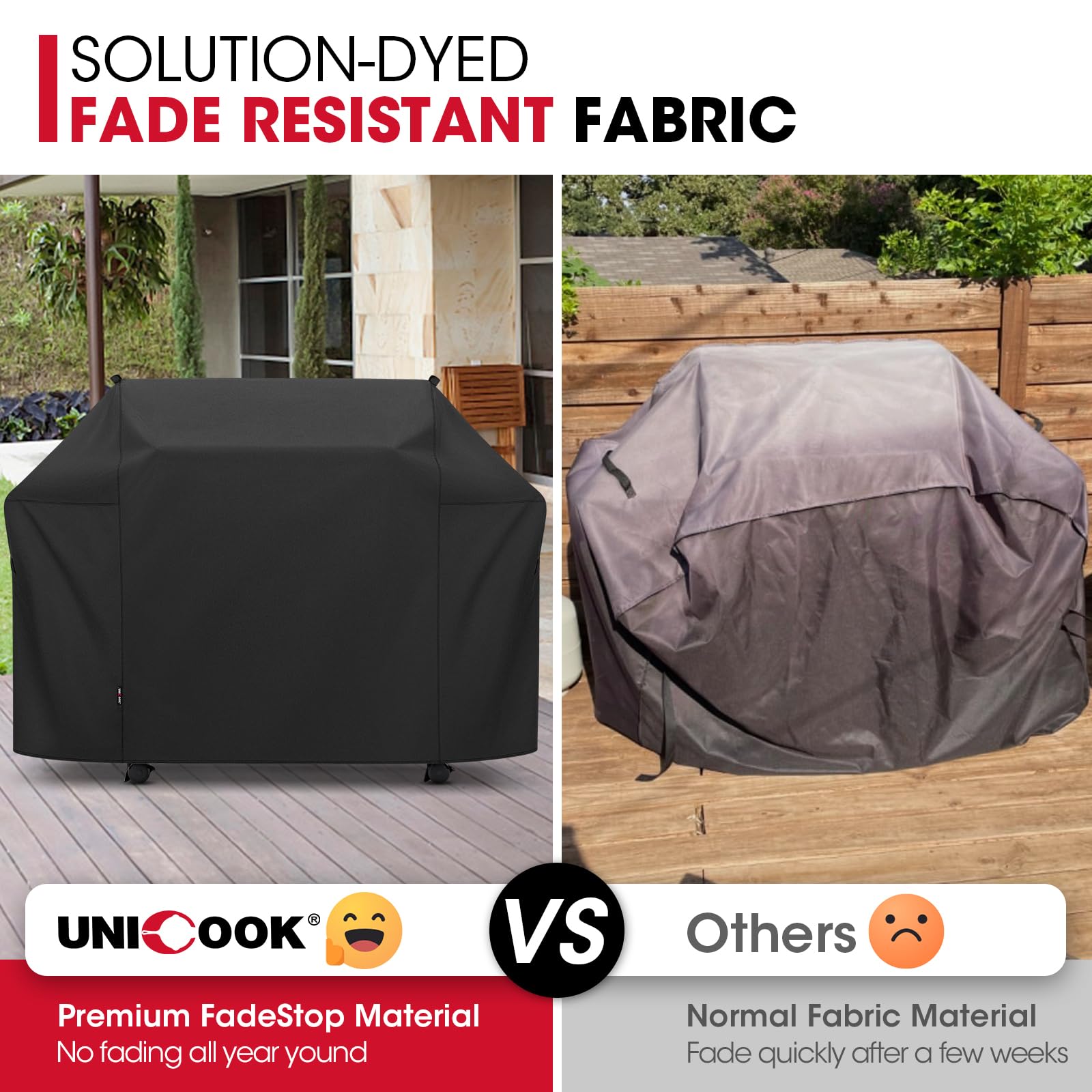 Fade Resistant and Durable: Crafted with solution-dyed fabric, this Unicook grill cover resists fading, tearing and cold cracking, and shields your grill from UV rays, dust, and debris throughout the year. No more sun faded covers
