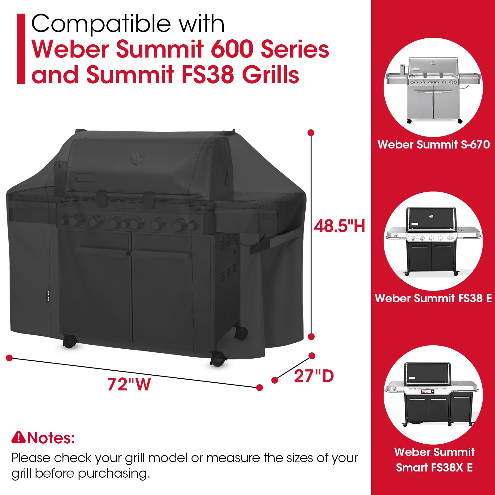 Large Grill Cover Dimension: 72"W x 27"D x 48.5"H, the Unicook gas grill cover for outdoor grill is compared to Weber 7109, compatible with Weber Summit 600 series and Summit Smart gas grills, such as E-620, E-670, S-620, S-670,FS38, and FS38x gas grills. It also fits 5-6 burner grills up to 70” wide from brands like Charbroil, Nexgrill, Kenmore, Monument, Napoleon and etc