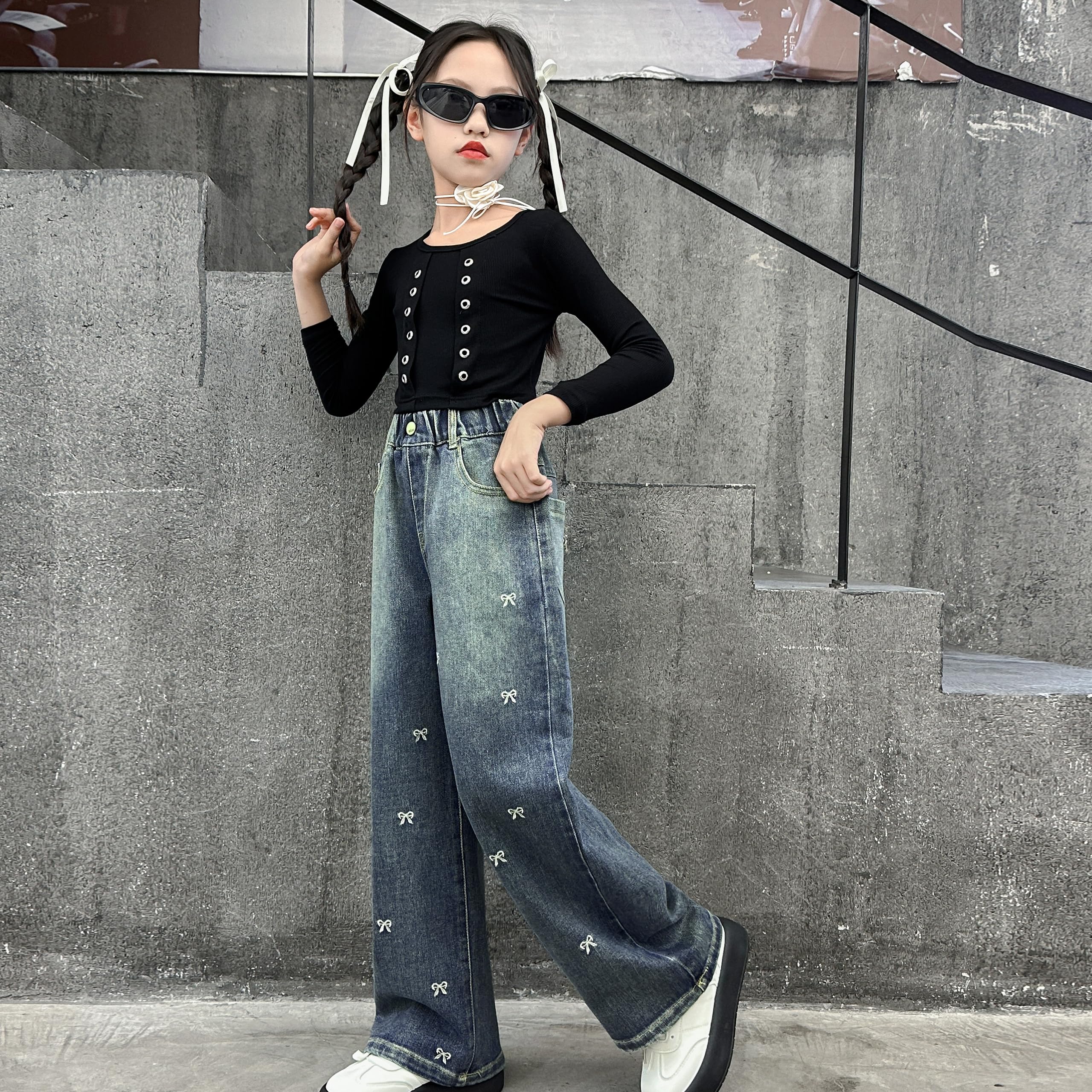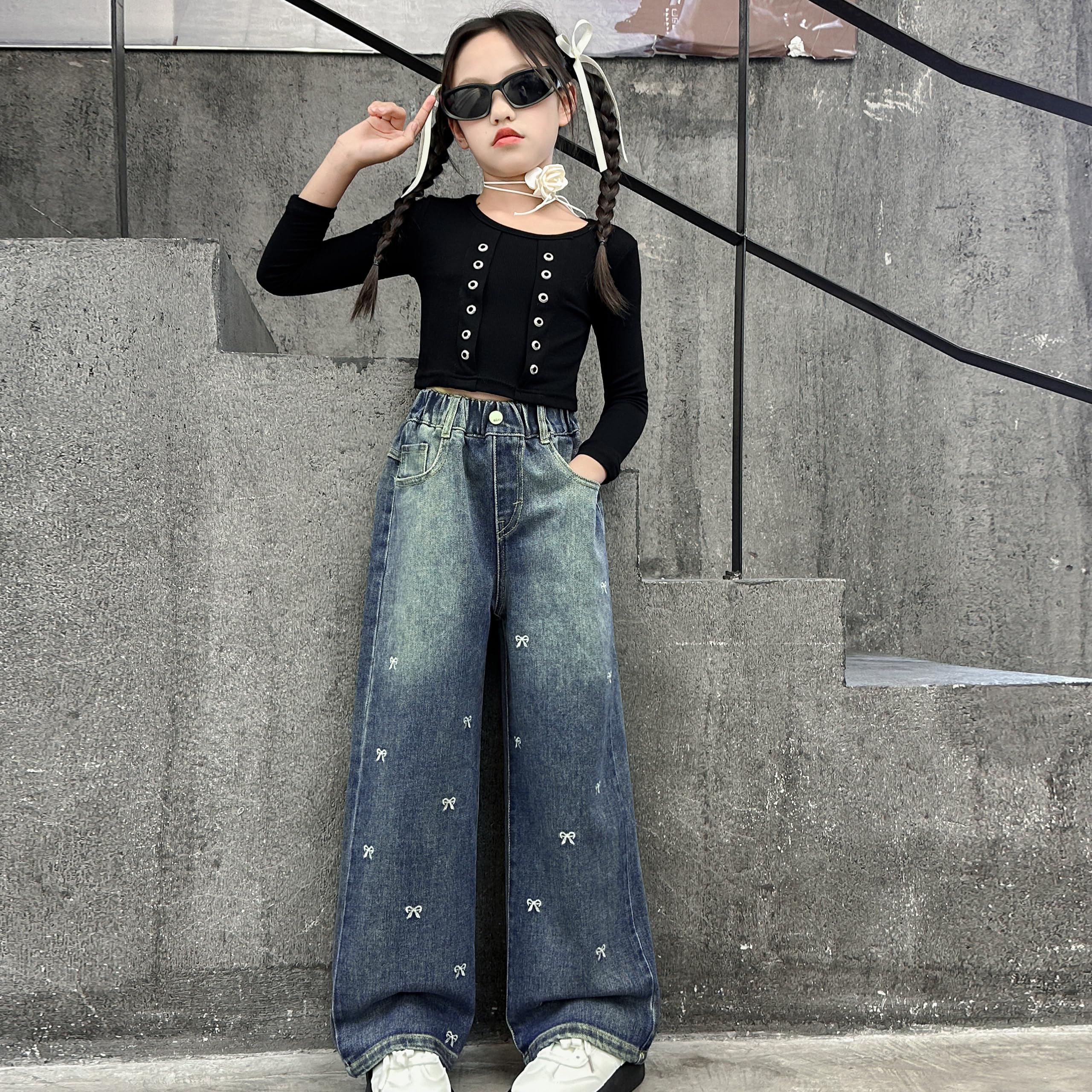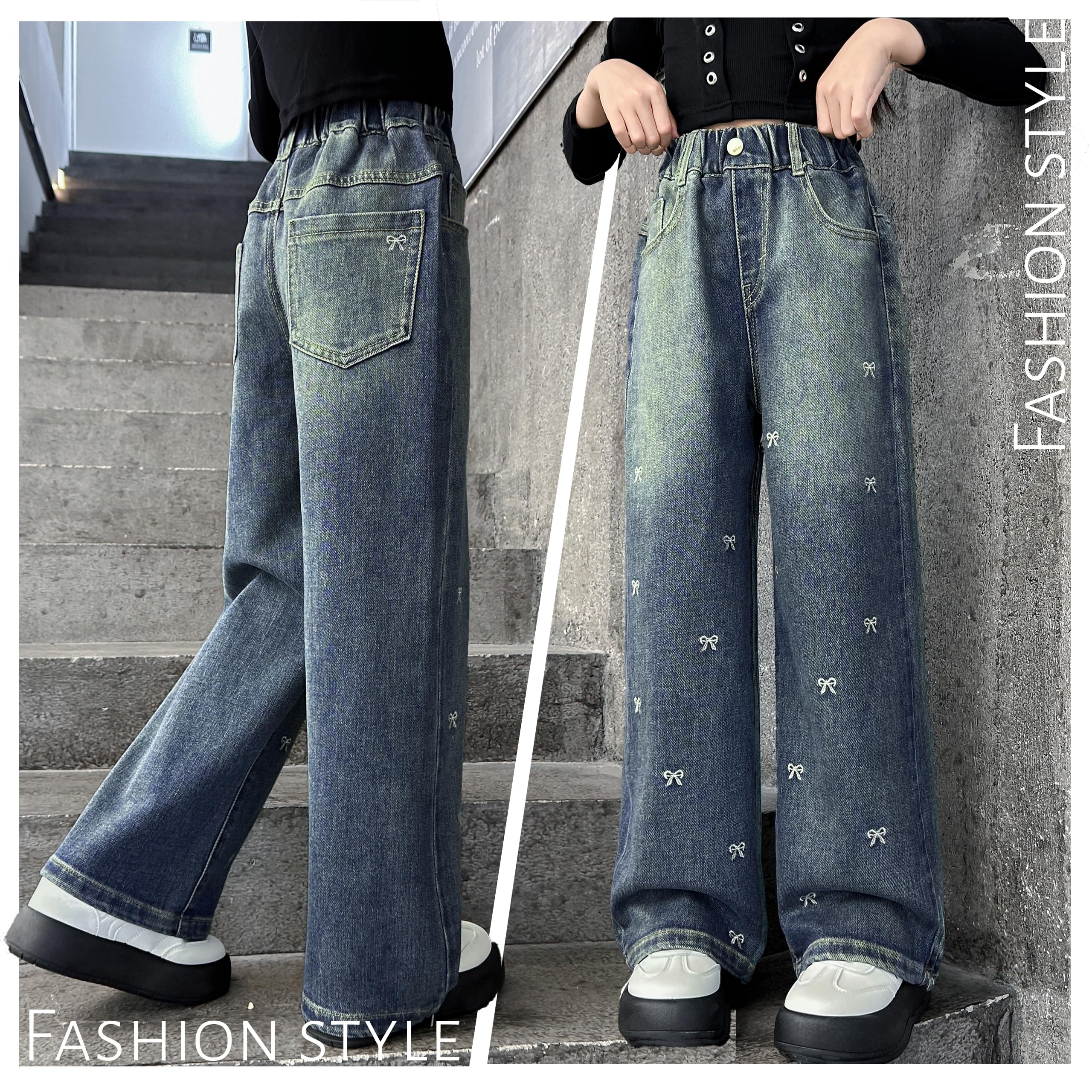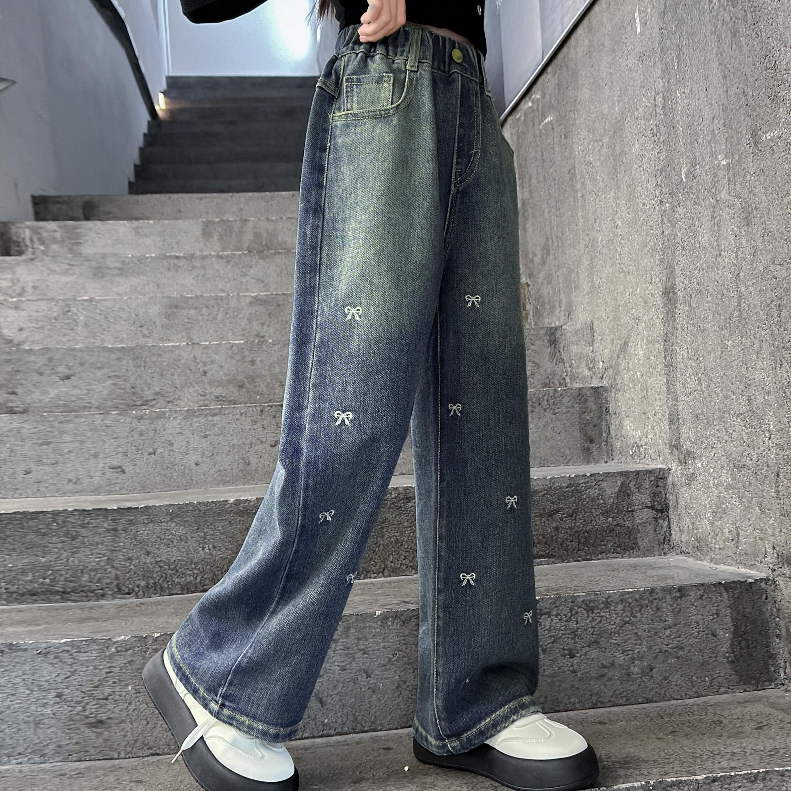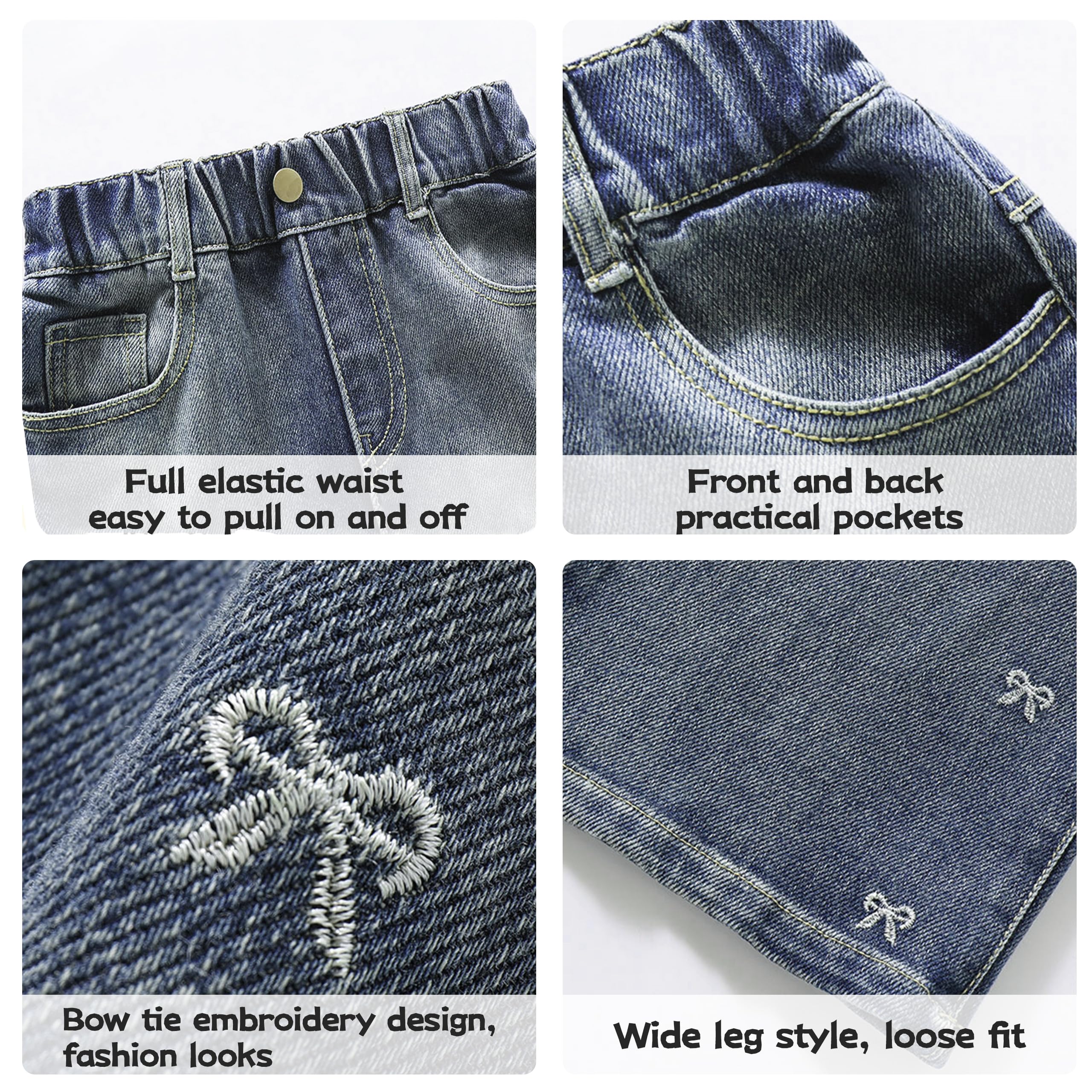Features: Girls baggy Jeans with trendy embroidery bowknot pattern, 2 pockets on front offer functional flair. Elastic waistband expands for a perfect fit and easy to wear, NO pilling