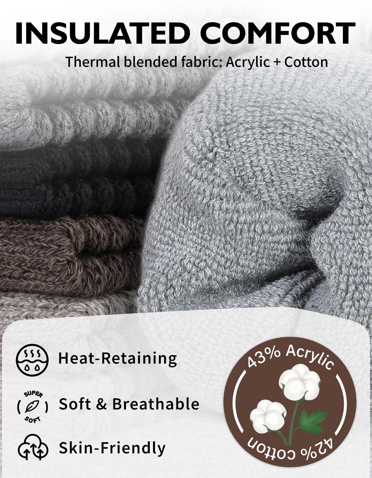 Warm and Comfortable: Made of a blend fabric of 43% Acrylic, 42% Combed Cotton, 10% Polyester, 5% Spandex, it provides a soft and comfortable touch, effectively locking in temperature and providing warm care for your feet, even in the cold winter.