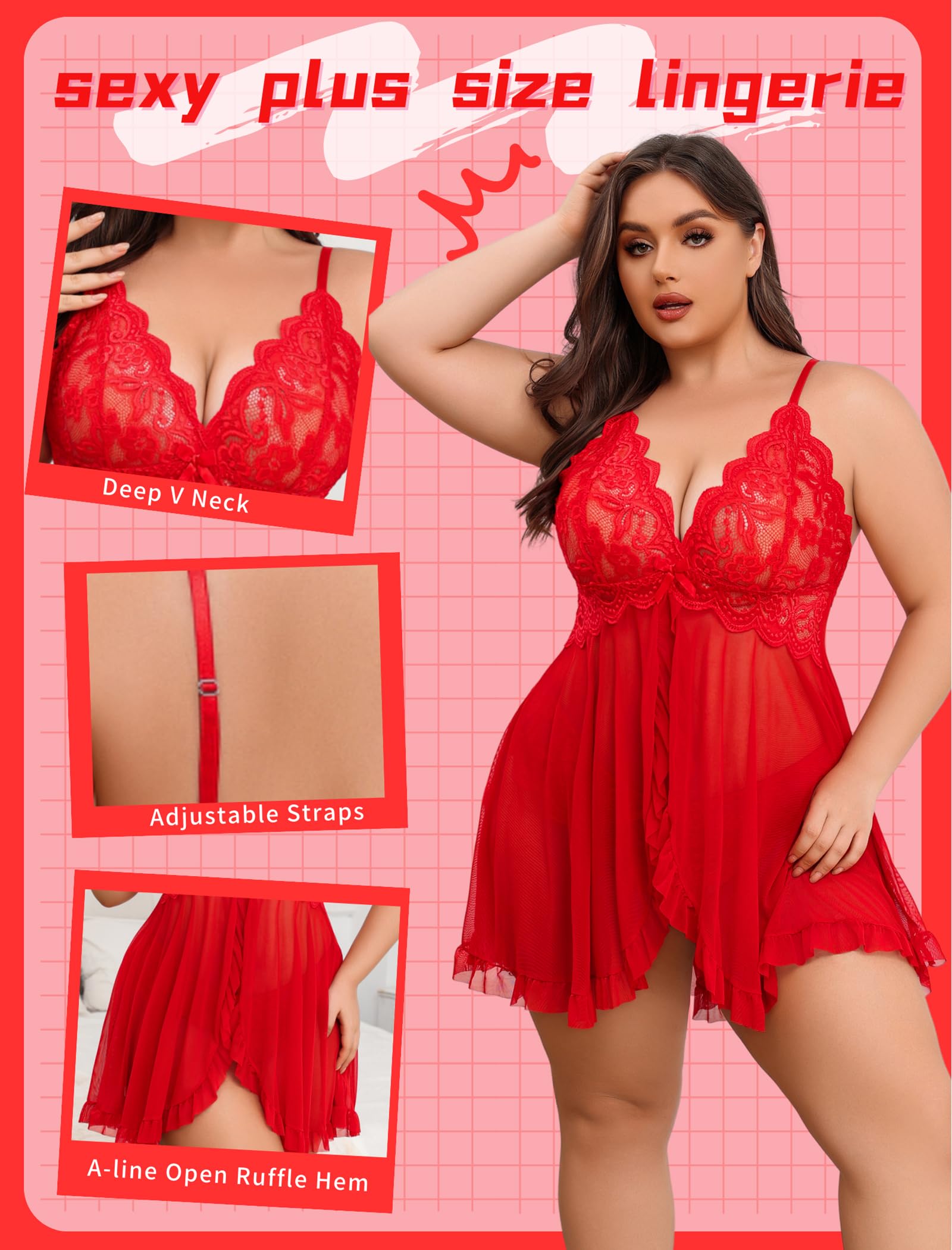 【Unique Design】This plus size sexy lingerie is featuring deep V-neck, adjustable spaghetti straps. The details of the lingerie fully meet your imagination.
