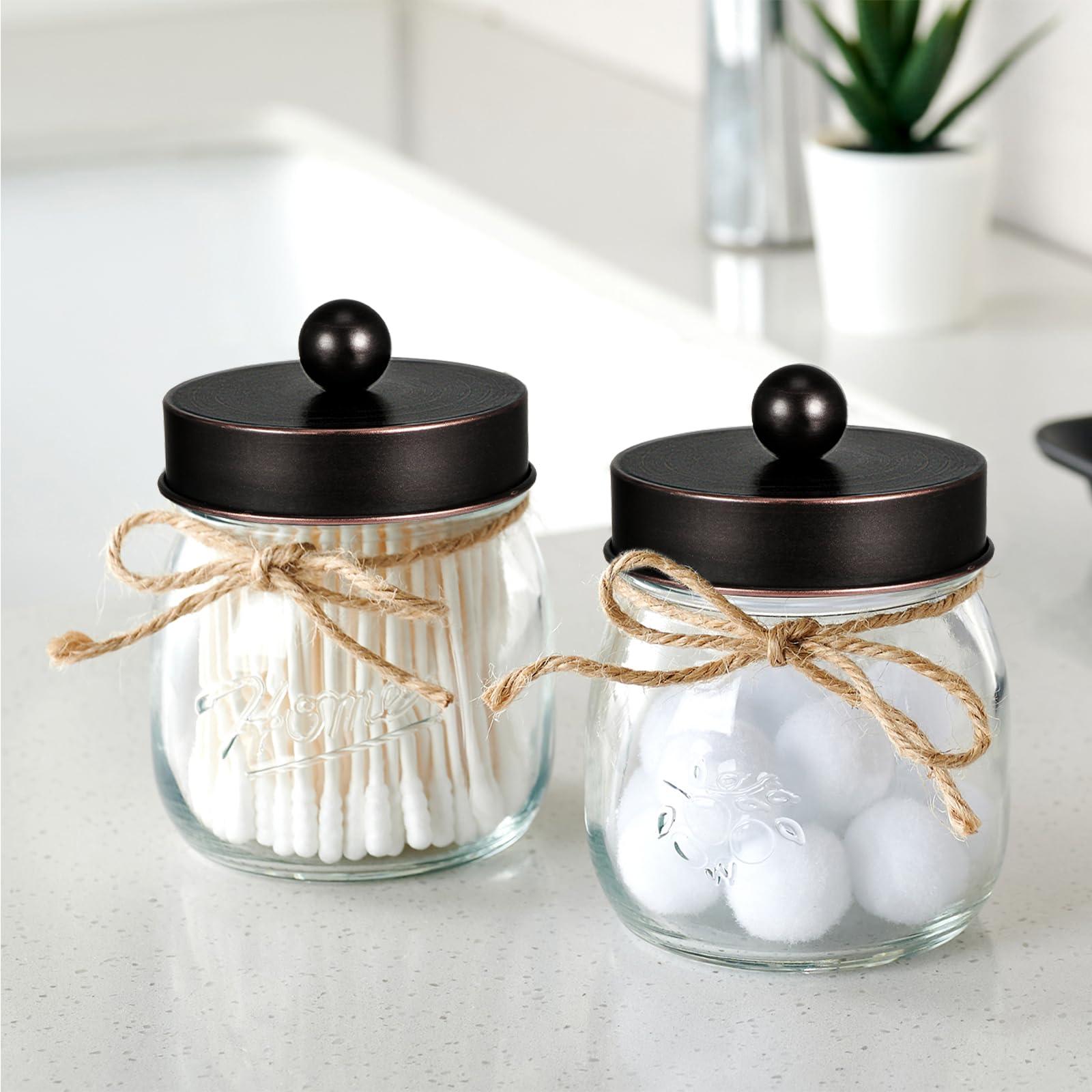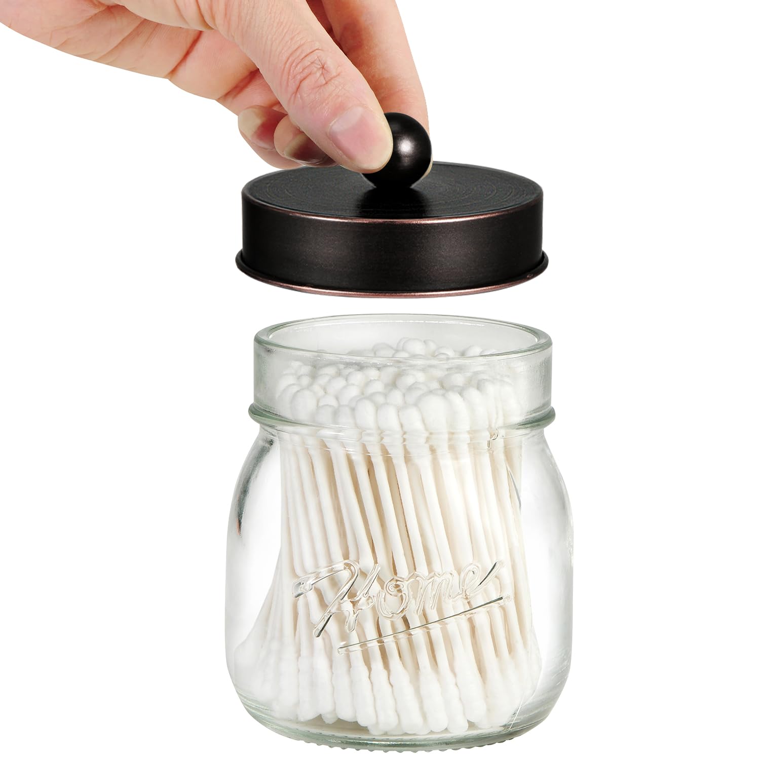 ✔️Easy to Open and Close: This bathroom set includes two 8-ounce glass mason jars with standard-size metal lids. Perfect for any bathroom and they are small enough to fit neatly and keep by the sink and not get in the way or make the counter look cluttered. These lids provide a secure fit, an easy-open design, and rust-resistant properties. Please note: the lids are designed for a lift-off mechanism rather than a screw-on closure. It makes it so much easier to lift off the top and reach in for a cotton ball or cotton swab.