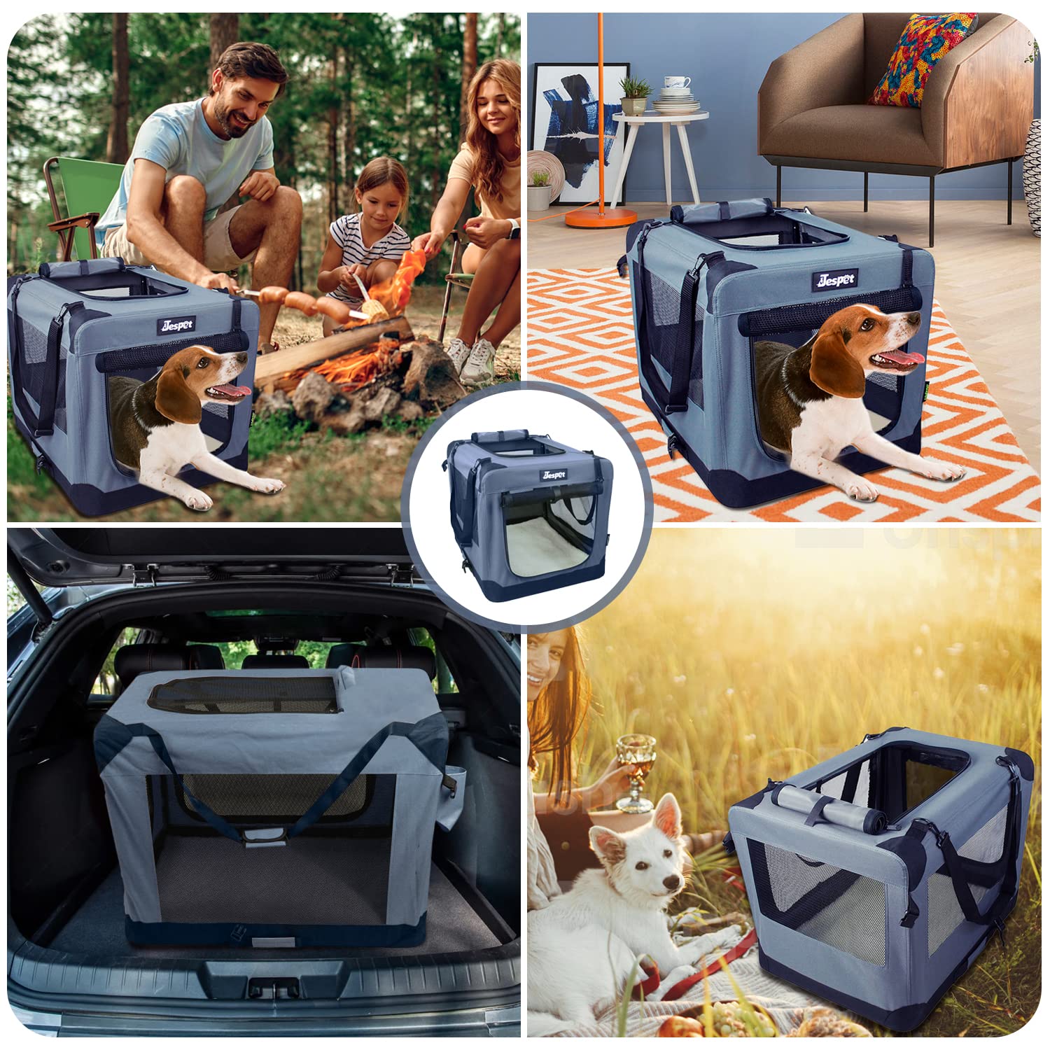Jespet Soft Dog Crate Dimensions: Folding soft-sided 27”L*20”W*20”H dog crate for large dogs up to 35 lbs. Our dog crate is 1" wider and 2" higher than most other brand 27" soft crates. Portable and lightweight soft dog crate make it easier for outdoor travel. All dimensions are measured manually, please allow deviation of 1 inch.