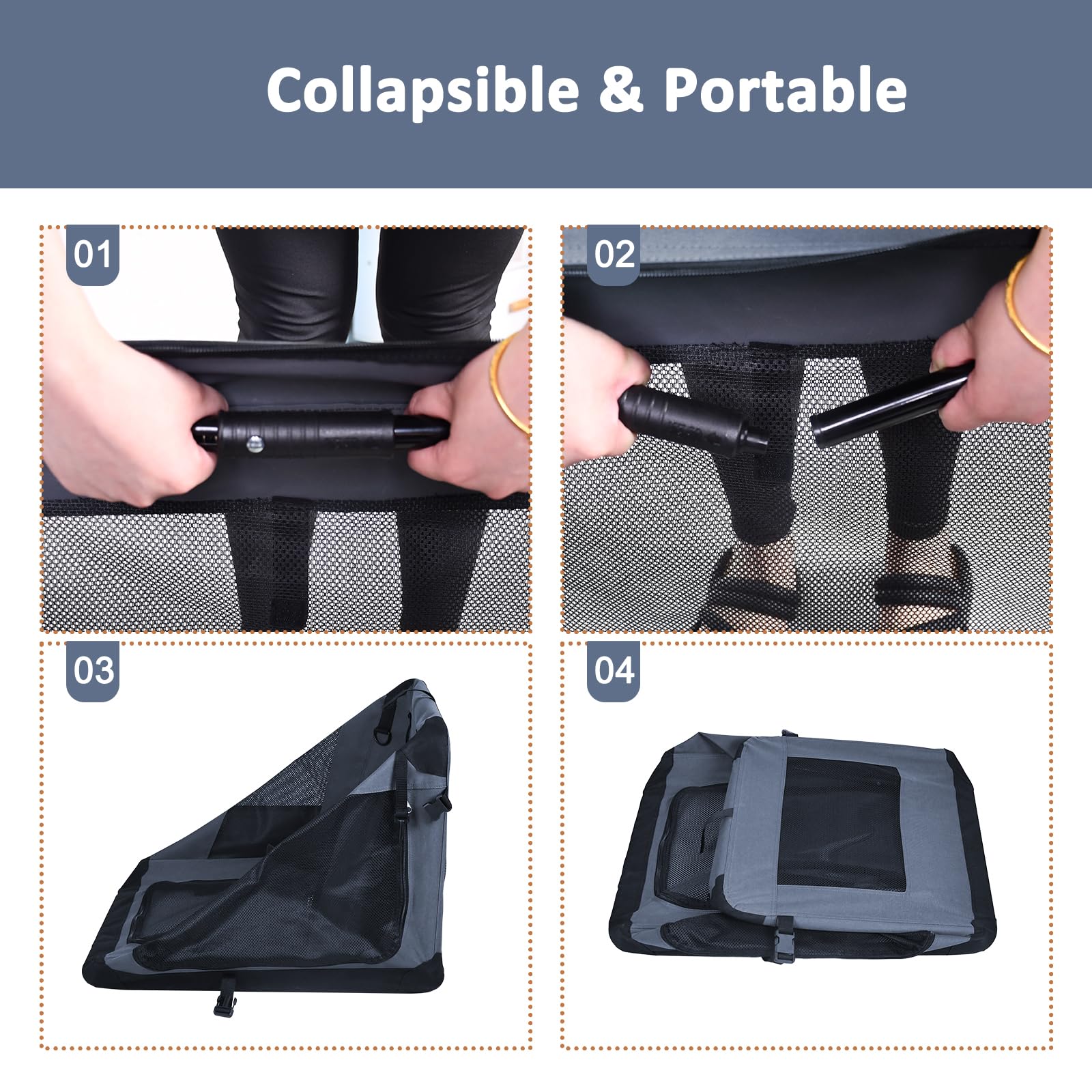 Foldable Strong Dog Crate: Crafted of 600D Cationic Oxford fabric and heavy-weight mesh, it boasts reliable sturdiness. The collapsible dog crate frame is make of strong steel tube; a well ventilated, stylish, lightweight and durable crate.
