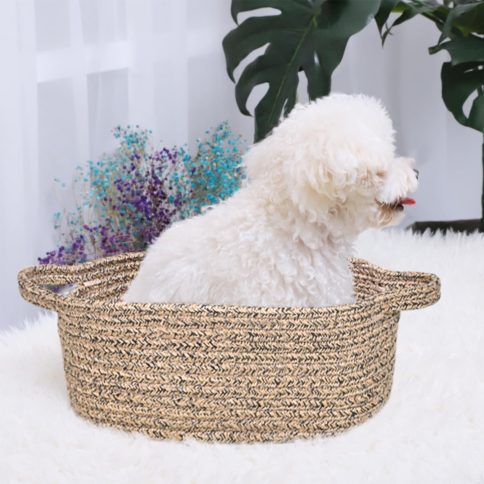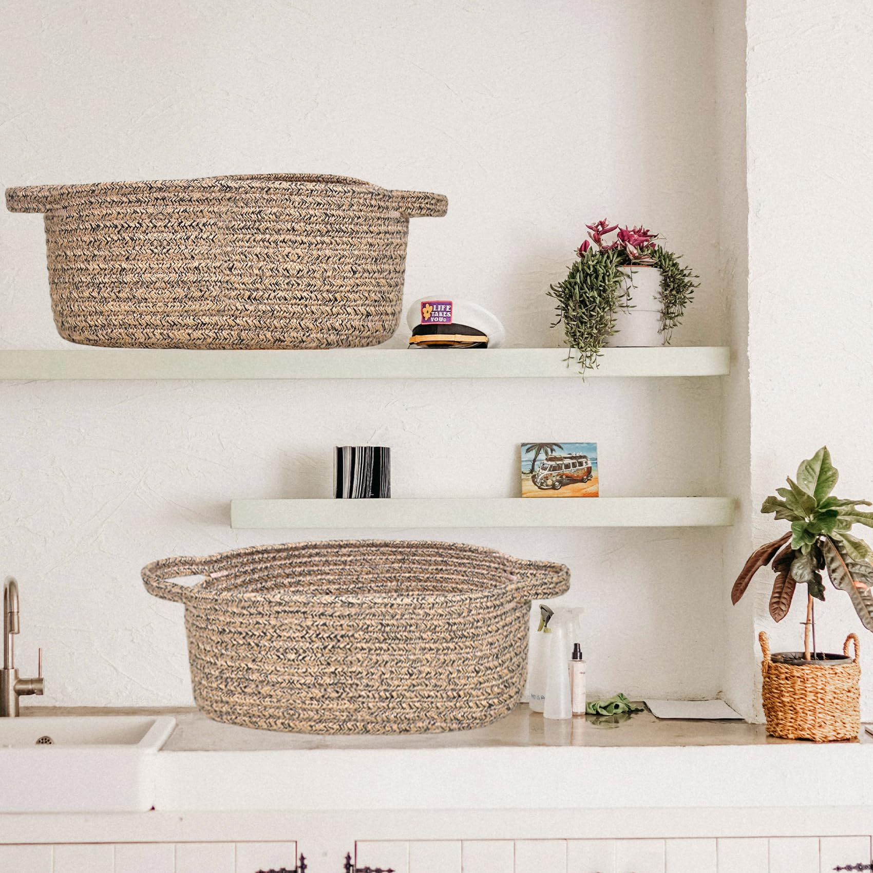 Small baskets for organizing, keep spa essential, fruits, remote control, towel, diaper, blanket, toy, nursery necessaries, make-ups organized in order. Even can be used as dog cat basket