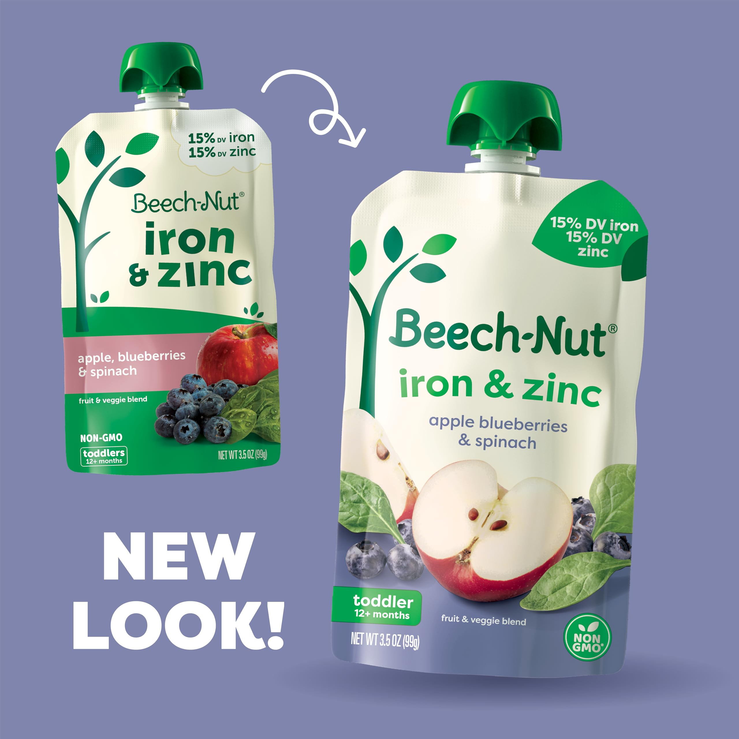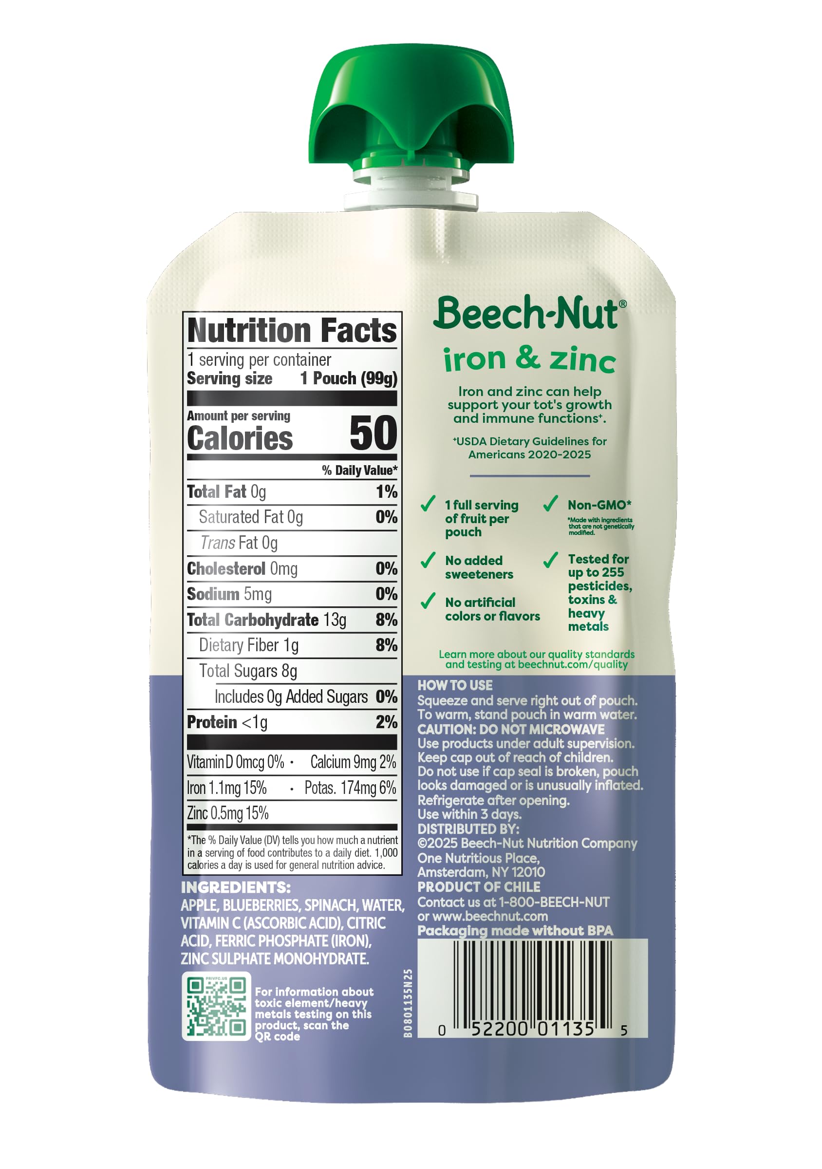 DELICIOUS BLEND OF APPLE, BLUEBERRY & SPINACH: Each pouch contains 15% recommended daily value of Iron and Zinc, making it easy to squeeze more nutrition into your little one's day.