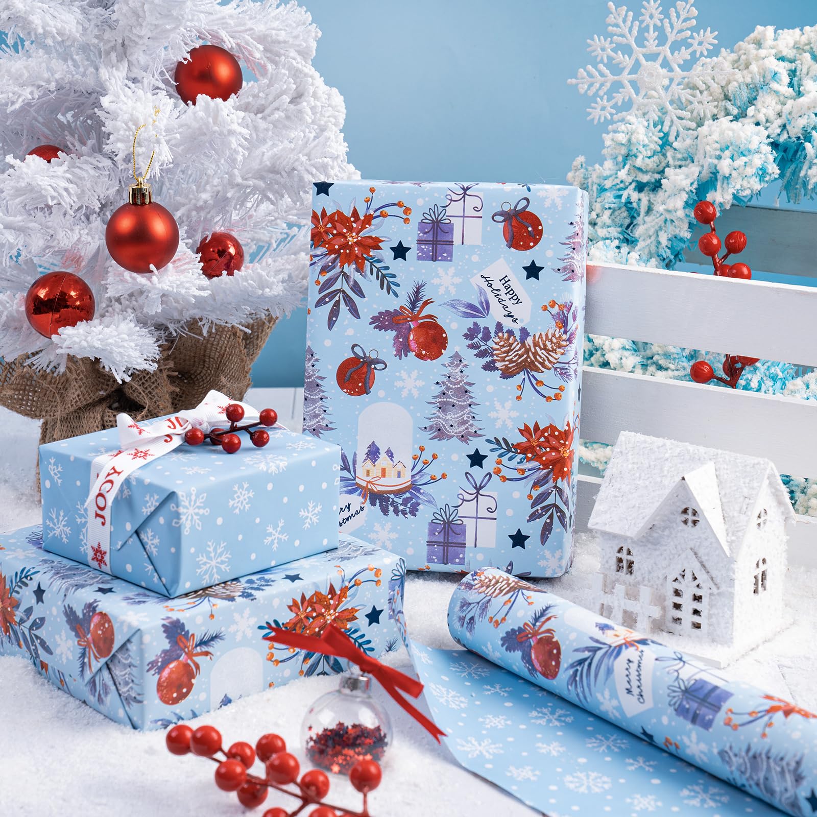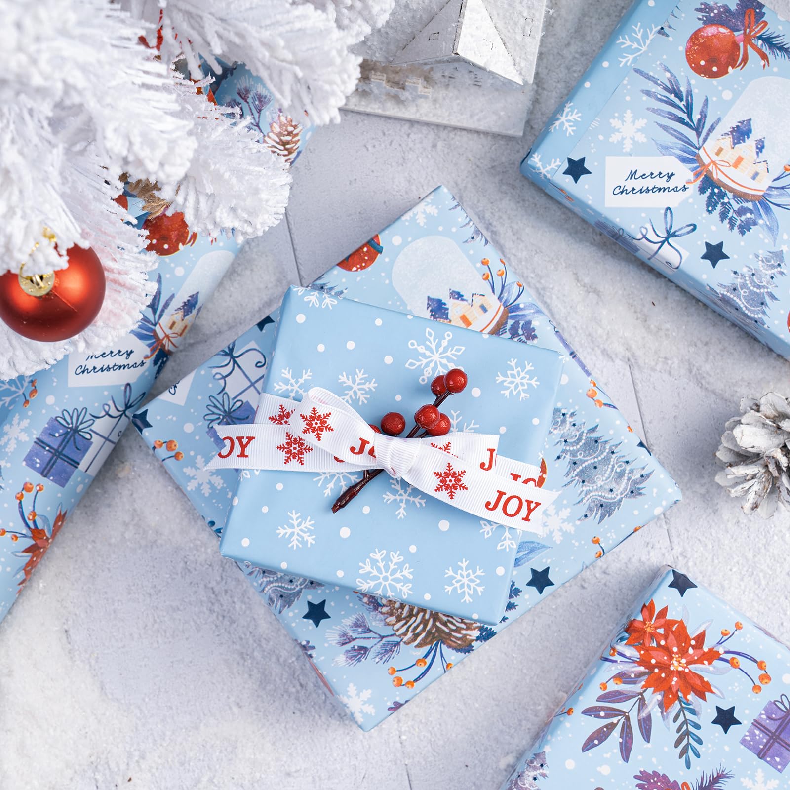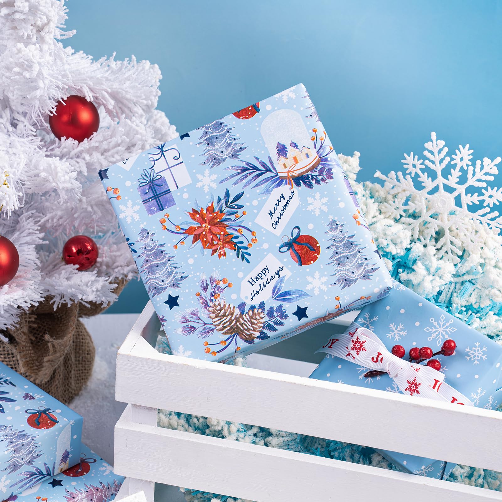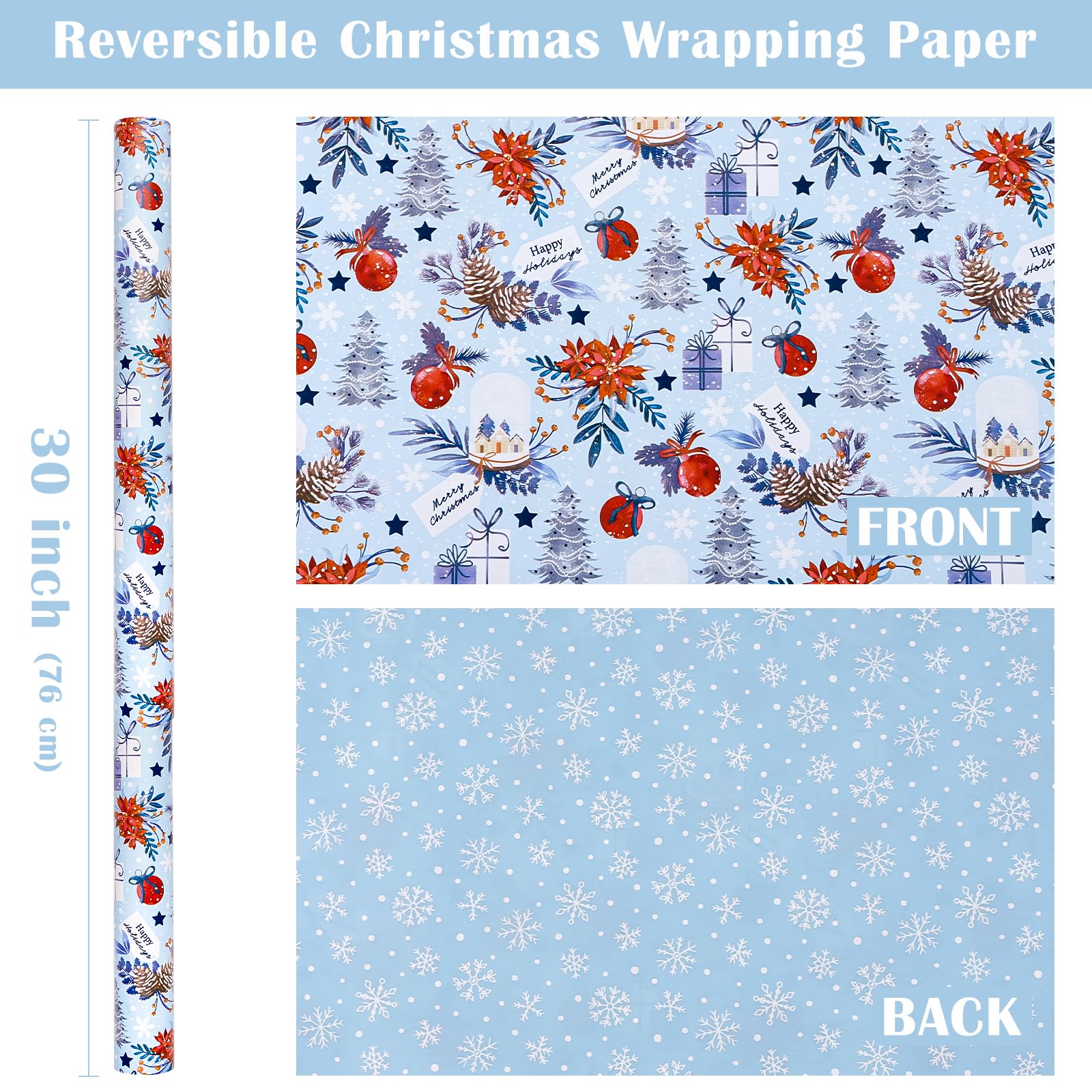 Perfect Size: Each roll measures 30 inch wide x 33 feet long. Providing you with a total of 81.8 square feet of paper, sufficient to cover a wide variety of gift sizes. Reversible: Christmas snow globe, pinecone, poinsettia, gift boxes and Christmas tree printed on one side, white and blue snowflakes printed on the reverse. Two different designs make unique and varied gift presentations easy. Premium Quality: Created with high-quality paper materials, thick and not easily tear or rip. Item came with shrink film to prevent wrapping paper from scratches and reduce dust. Use All Winter: Whether it's the joyous celebration of Christmas or the holiday season filled with family gatherings and gift - giving traditions, it is an outstanding choice. It is also great for decorating the Christmas tree. Wrap Your Love for Christmas: You can wrap your love with our special Christmas wrapping paper, adding a splash of color to all of your gifts. Your family, children, and friends will feel your sincere Christmas wishes this holiday season. Quality Customer Service: Any question about products or orders, please feel free to contact the customer service, we will try our best to solve the problem.
