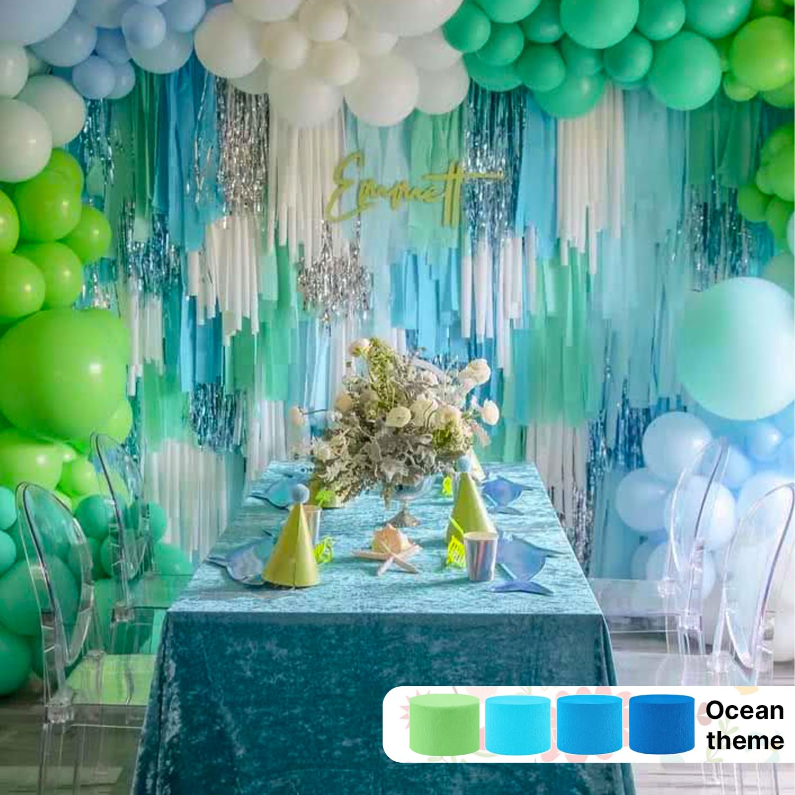 PACKAGE SPECIFICATIONS: The package includes lime green crepe papers (1 roll), pastel green crepe paper (1 roll), emerald green crepe paper (1 roll), pastel blue streamers (1 roll), ocean blue streamers (1 roll), blue streamers (1 roll), 6 pieces in total. Each roll of party streamers is 0.15 * 82 feet / 4.5cm * 25m (W*L), ideal birthday decorations, wedding decorations, baby shower decorations