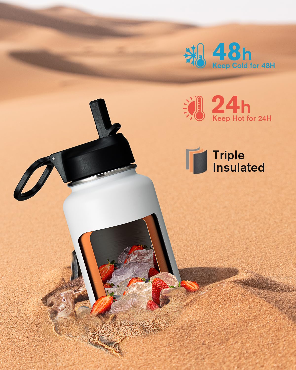 48H Cold & 24H Hot: Triple Insulation Technology adopts double wall and vacuum seal, keeps beverages cold for up to 48 hours and hot 24 hours. Anti-sweat coating can keep the surface dry and clean, making it easy to grip
