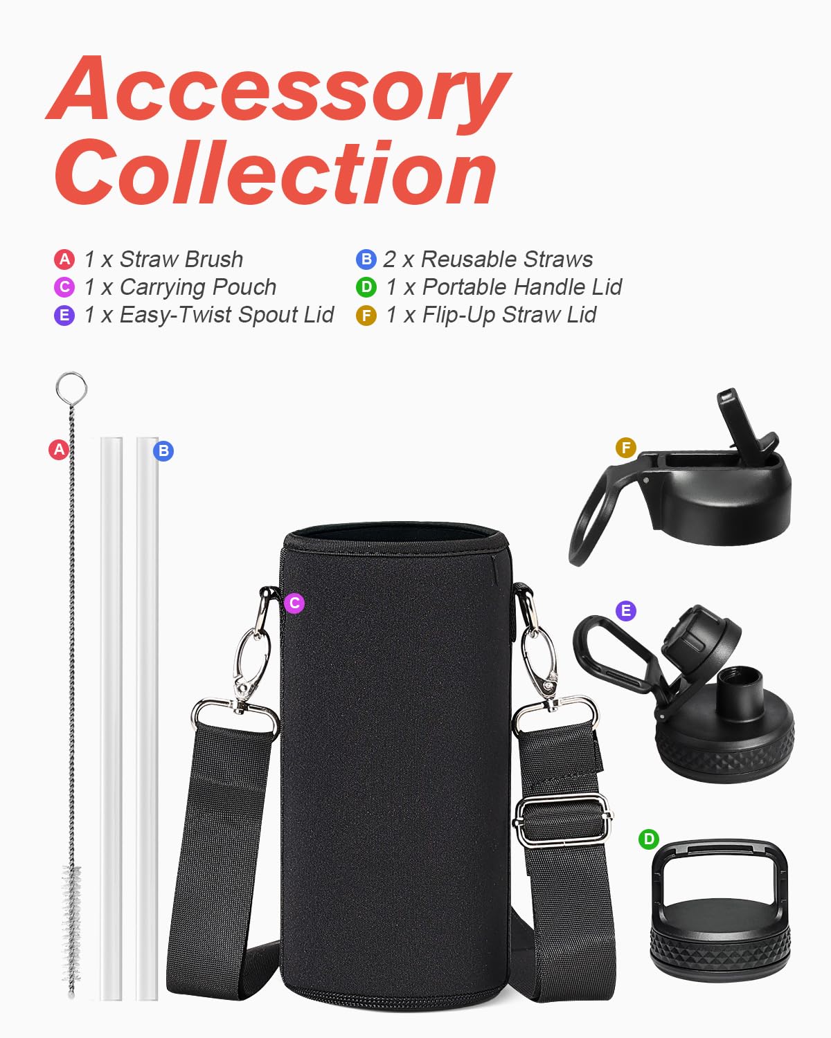 Flexible Drinking On-the-Go: This water jug comes with 3 different lids. The screw-on lid with flip-up handle is for easy ice refilling with superior portability; spout lid makes it convenient to drink hot liquid and straw lid for sipping cold