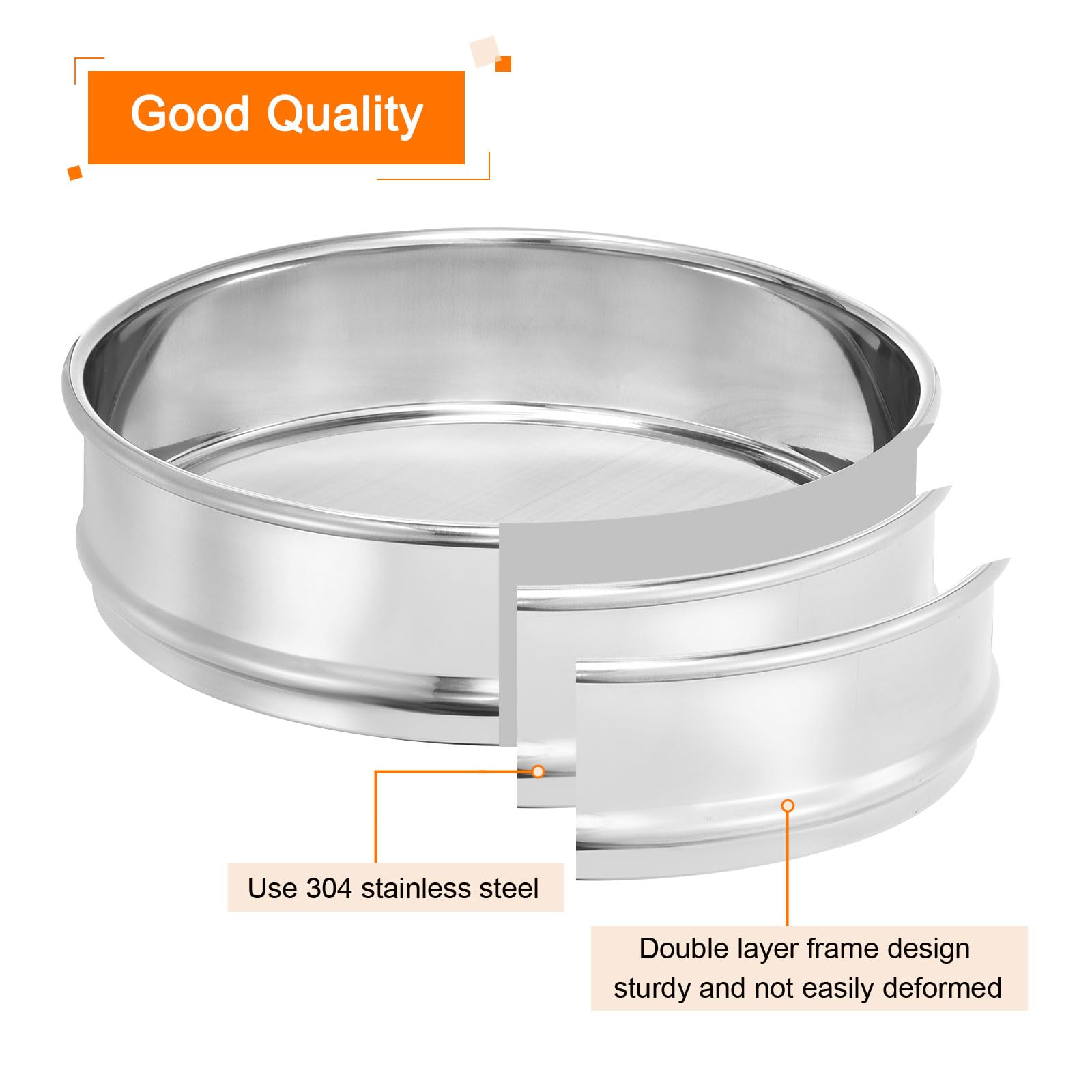 Good Quality: Use double layer frame design, all use 304 stainless steel, strong and sturdy and not easily deformed can bear weight up to 220 pounds, the screen mesh is made of standard 304 stainless steel, with precise aperture, flat and not easy to fall off
