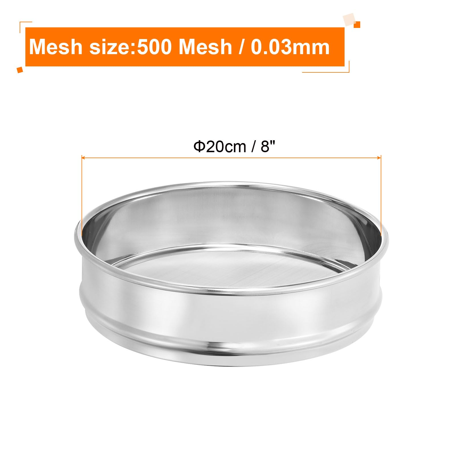 Lab Test Sieve: The size for this lab sieve is 500 Mesh / 0.03mm mesh, 20cm / 8" diameter, 5.5cm / 2.17" height