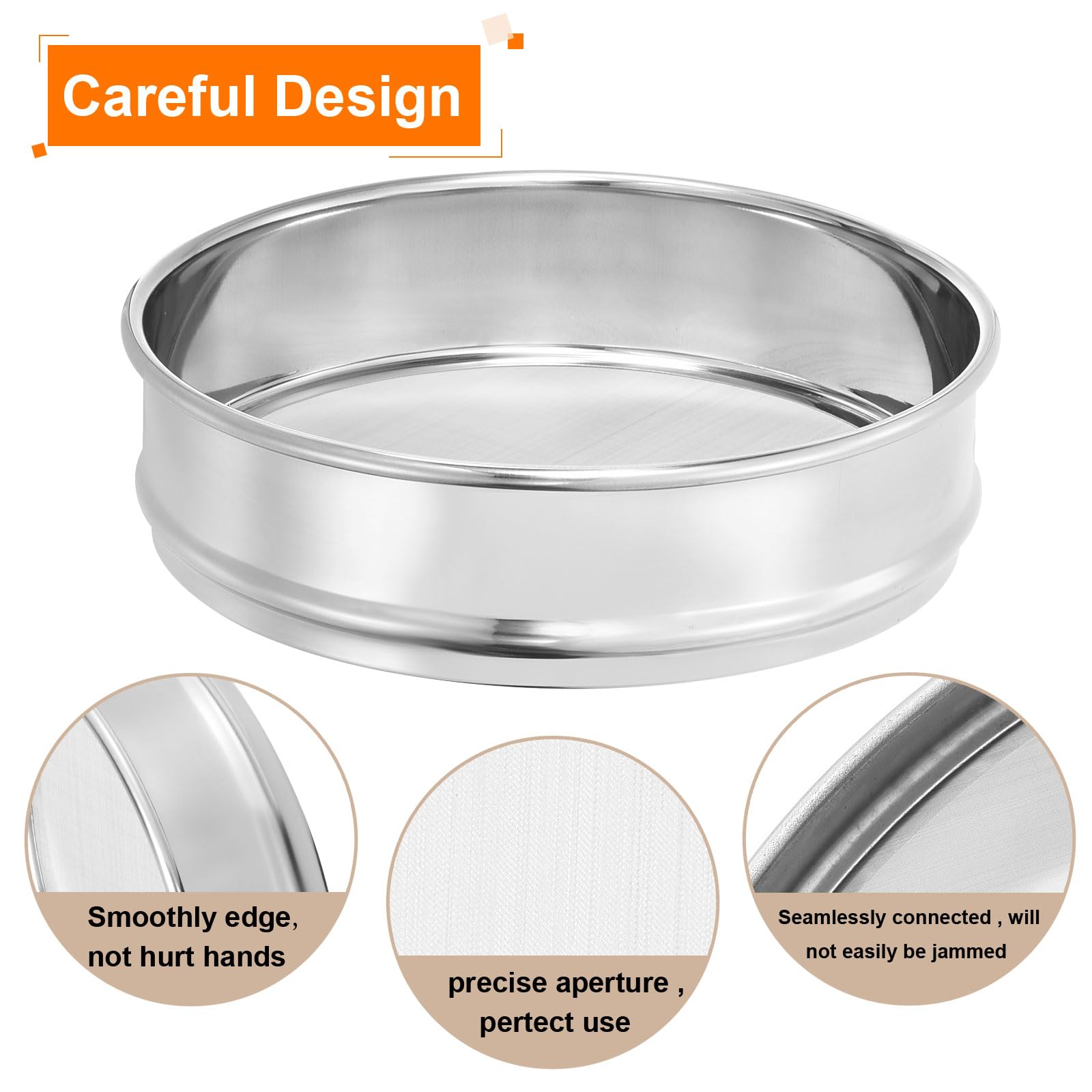 Careful Design: The test sieve bottom edge pressing is smooth, the screen is not exposed will not sticky, the screen frame and screen are seamlessly connected so will not easily jammed and is easy to clean, can be used repeatedly, more efficient