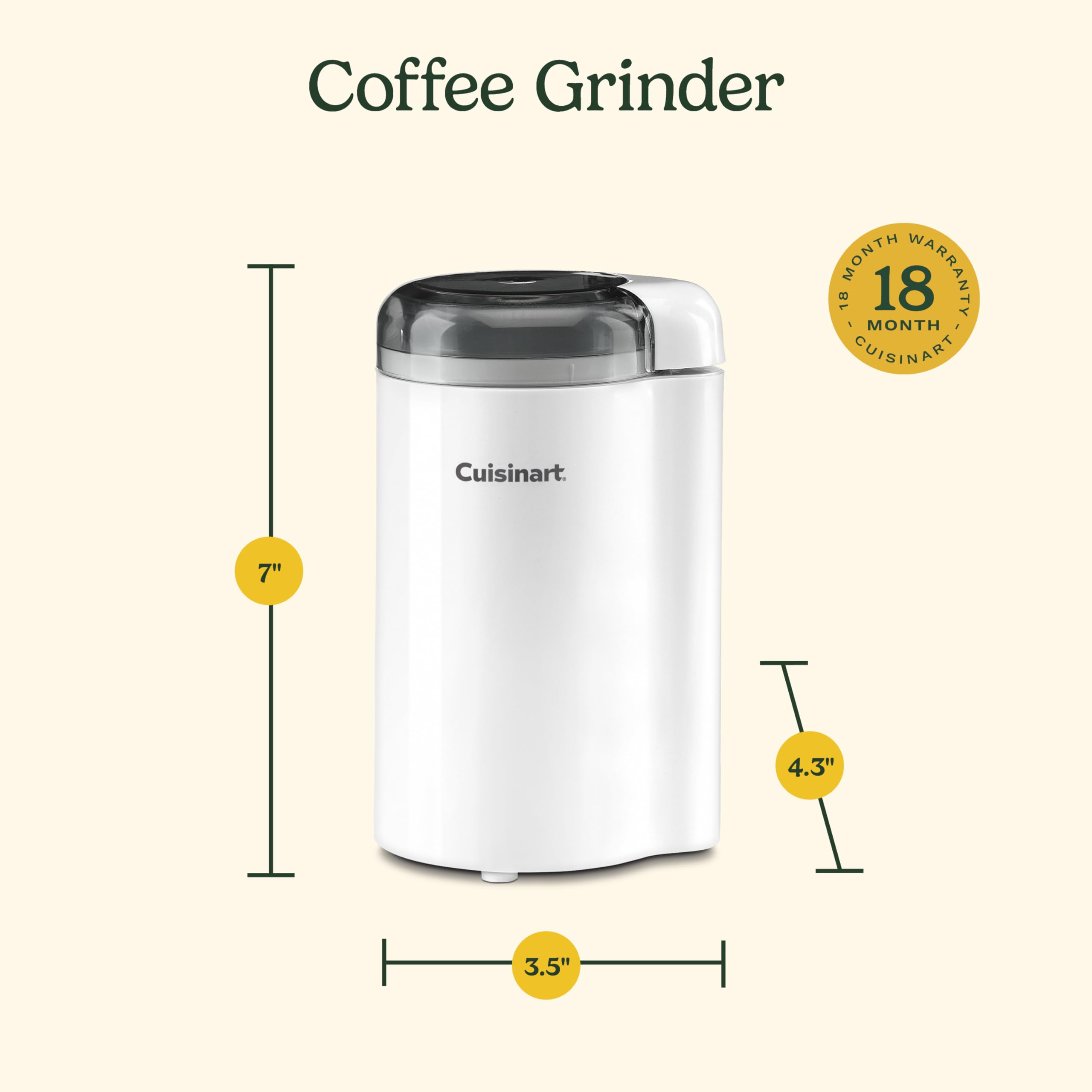 Amazon.com With Cuisinart's handsome, compact coffee grinder, it's easy to always have fresh coffee made to exact specifications. Its clean lines and teardrop shape make the grinder easy to hold, and it runs with the push of a button in its lid. To use, simply measure coffee beans into the bowl, replace the lid, and hold down the button until the coffee is ground to the desired consistency. Unplug the grinder when it's not in use--the cord can be stored in the base of the unit. --Jennifer Harris Product Description Pair your coffeemaker with the Cuisinart Coffee Grinder to bring out the freshest flavor from your whole beans. With a simple On/Off switch, you can grind enough 70g/2.5oz of coffee beans to make 12 fresh cups in no time! LIMITED 3-YEAR WARRANTY: Refer to user manual for troubleshooting steps, and questions surrounding warranty policies.