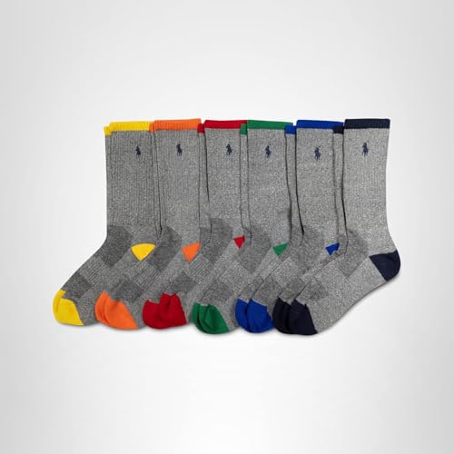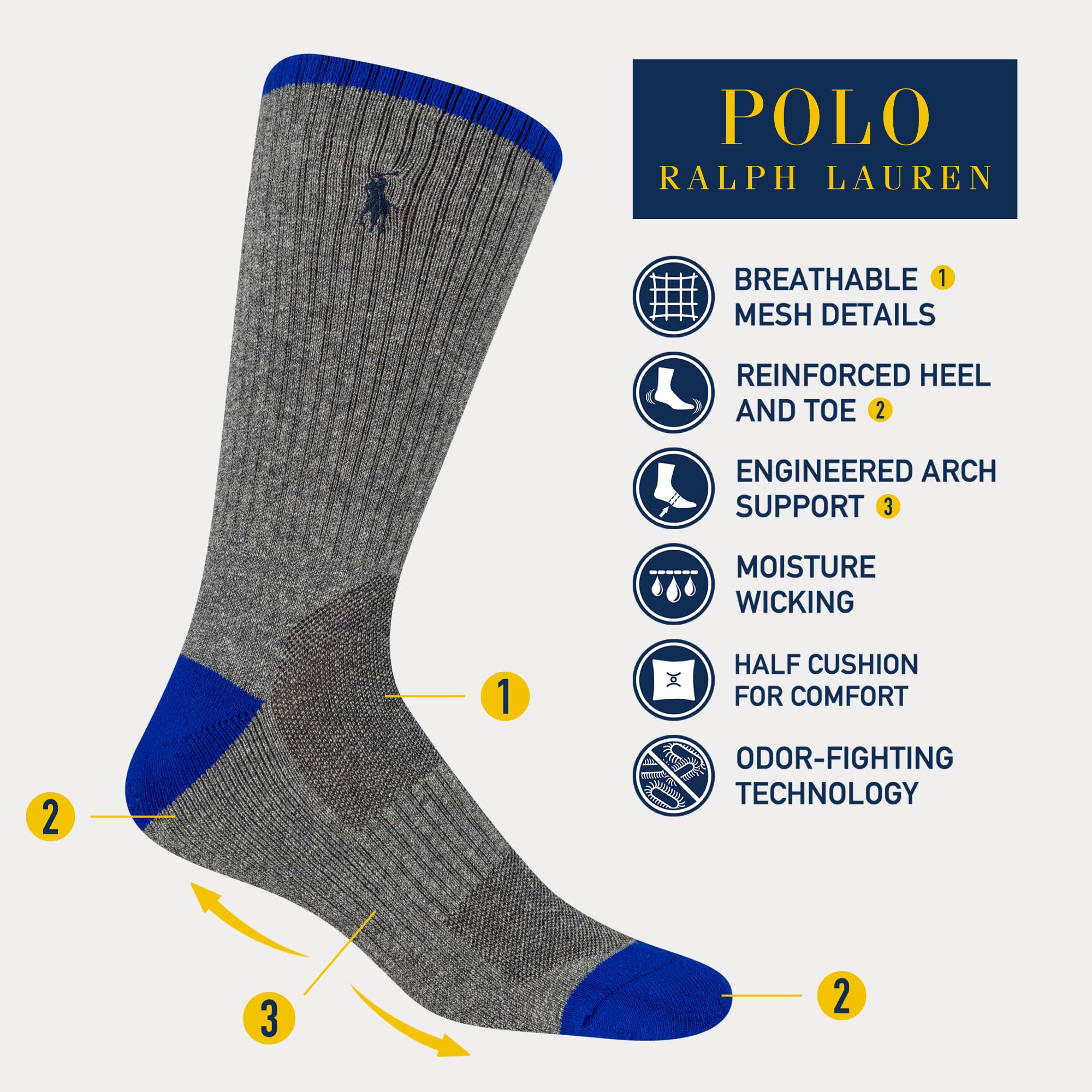 Description Discover timeless style and comfortable fit in every pair of socks from Polo Ralph Lauren. Take on the court or field in ultimate comfort when you wear these men's high-performance, cotton crew socks. Each pair in this six pack features a comfortable rib knit, a finish for odor-free freshness, a reinforced toe and heel and is embroidered with the signature Polo Pony for a subtle nod to sophistication. A selection of neutral colors makes them easy to style. Premium socks are the ideal gift for any occasion – birthday, graduation, Christmas, or Father’s Day. Explore the world of Polo Ralph Lauren and find superior quality in each pair of ultra-soft socks that your son or husband will truly appreciate for years to come.