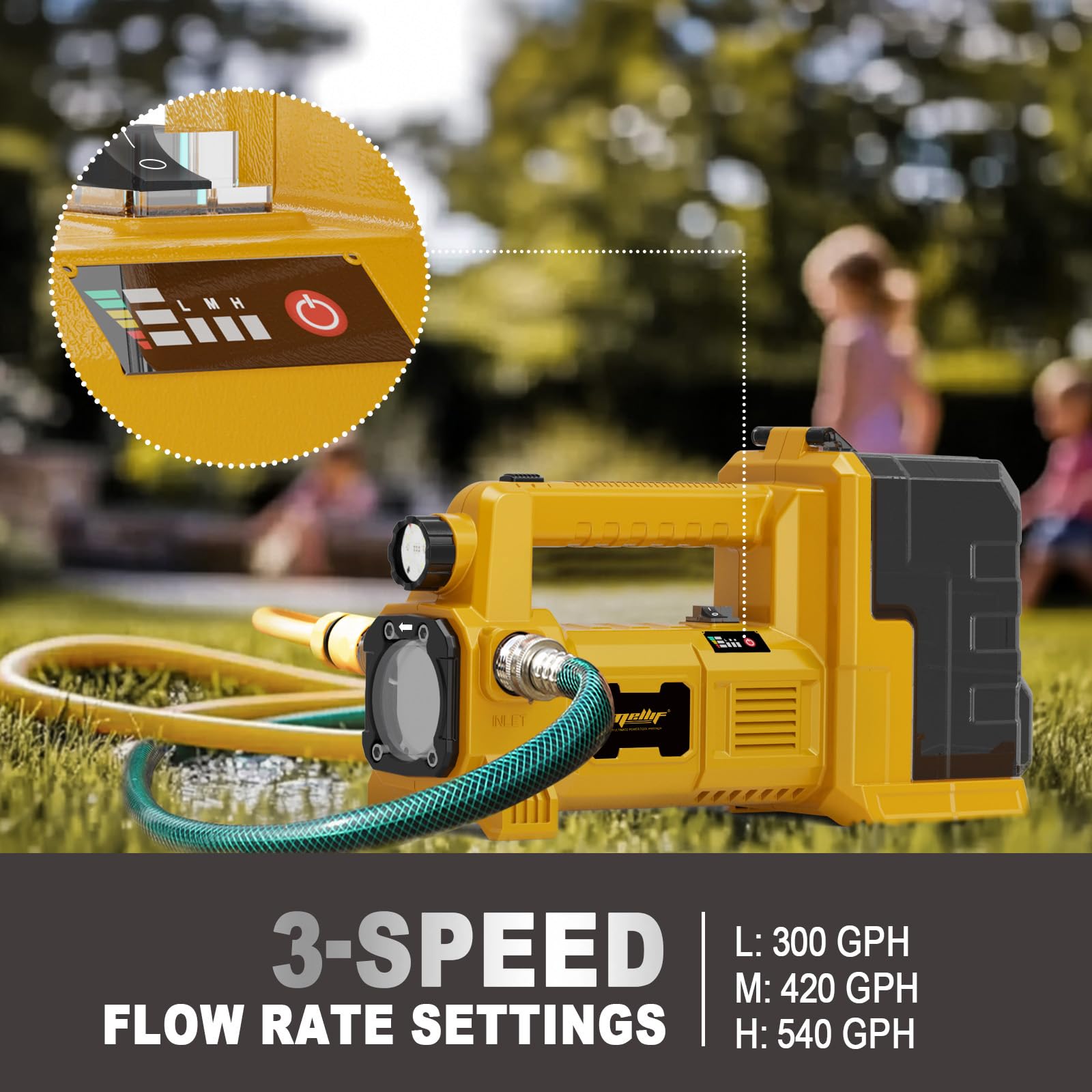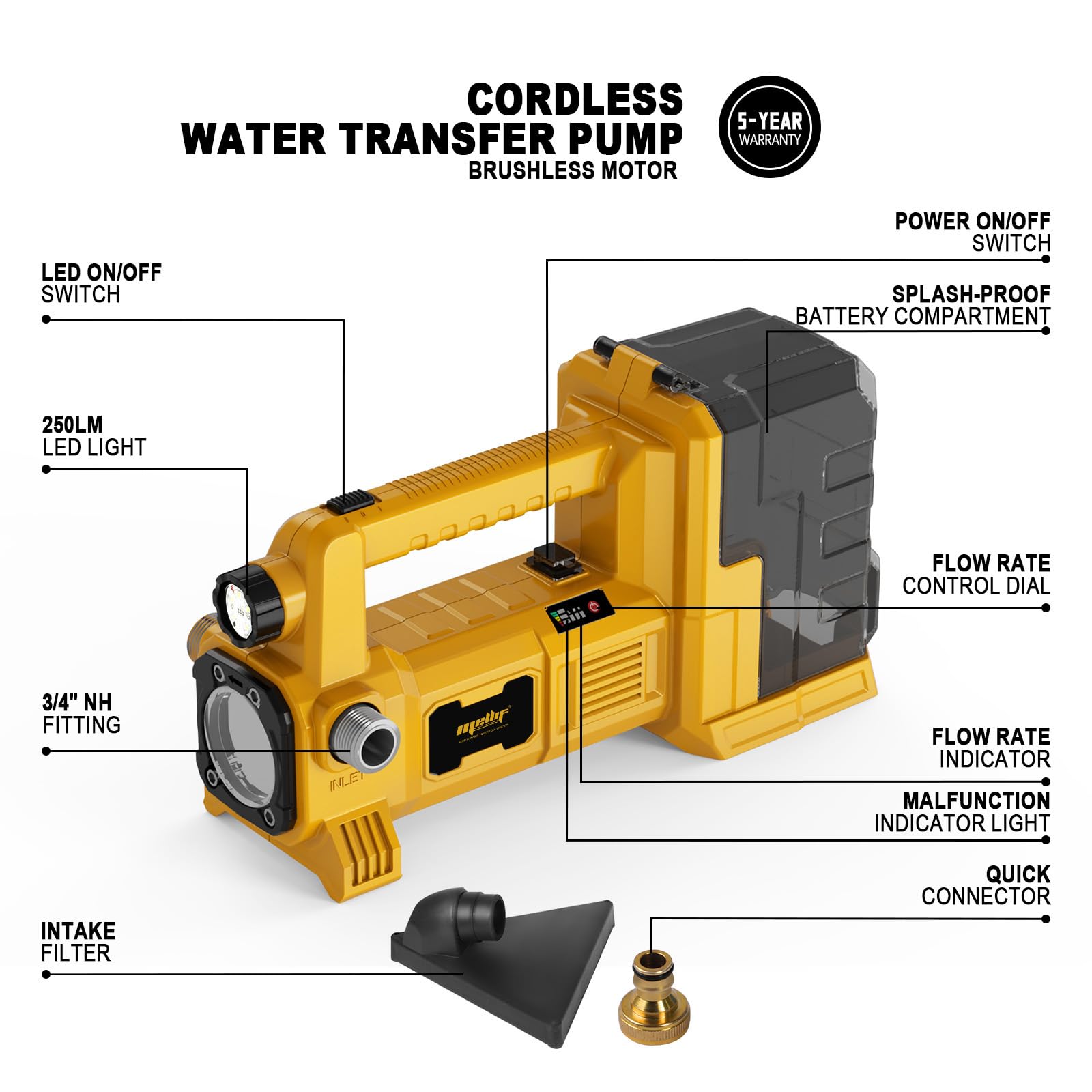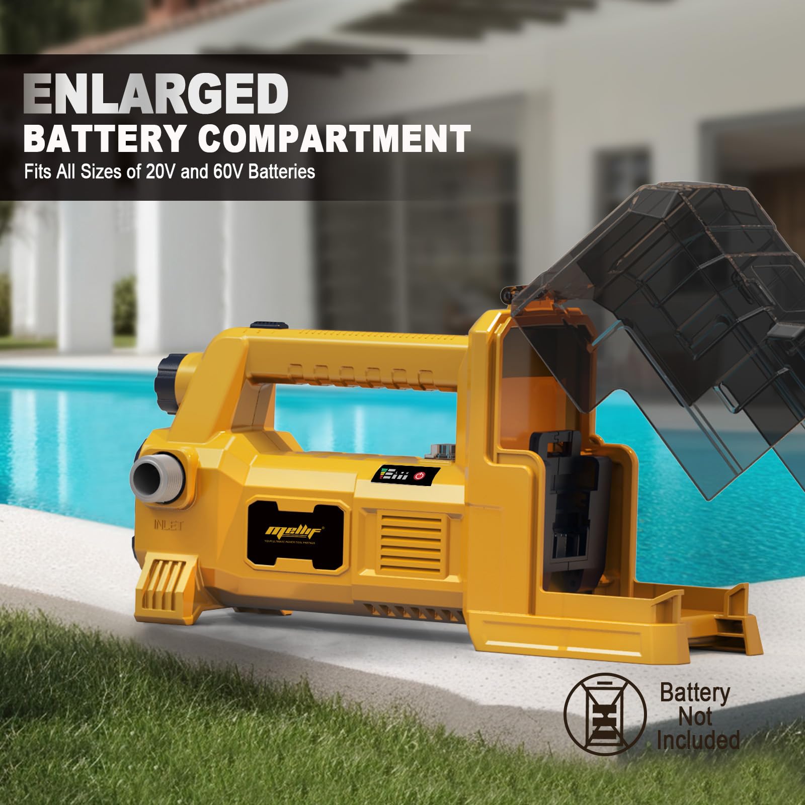 Cordless Water Transfer Pump: Compatible with Dewalt 20V MAX batteries(Battery and Charger Not Included). Features an enlarged battery compartment to accommodate all battery sizes, providing more powerful performance. Search for ASIN: B0CKXL5CJS if you are looking for replacement Impeller