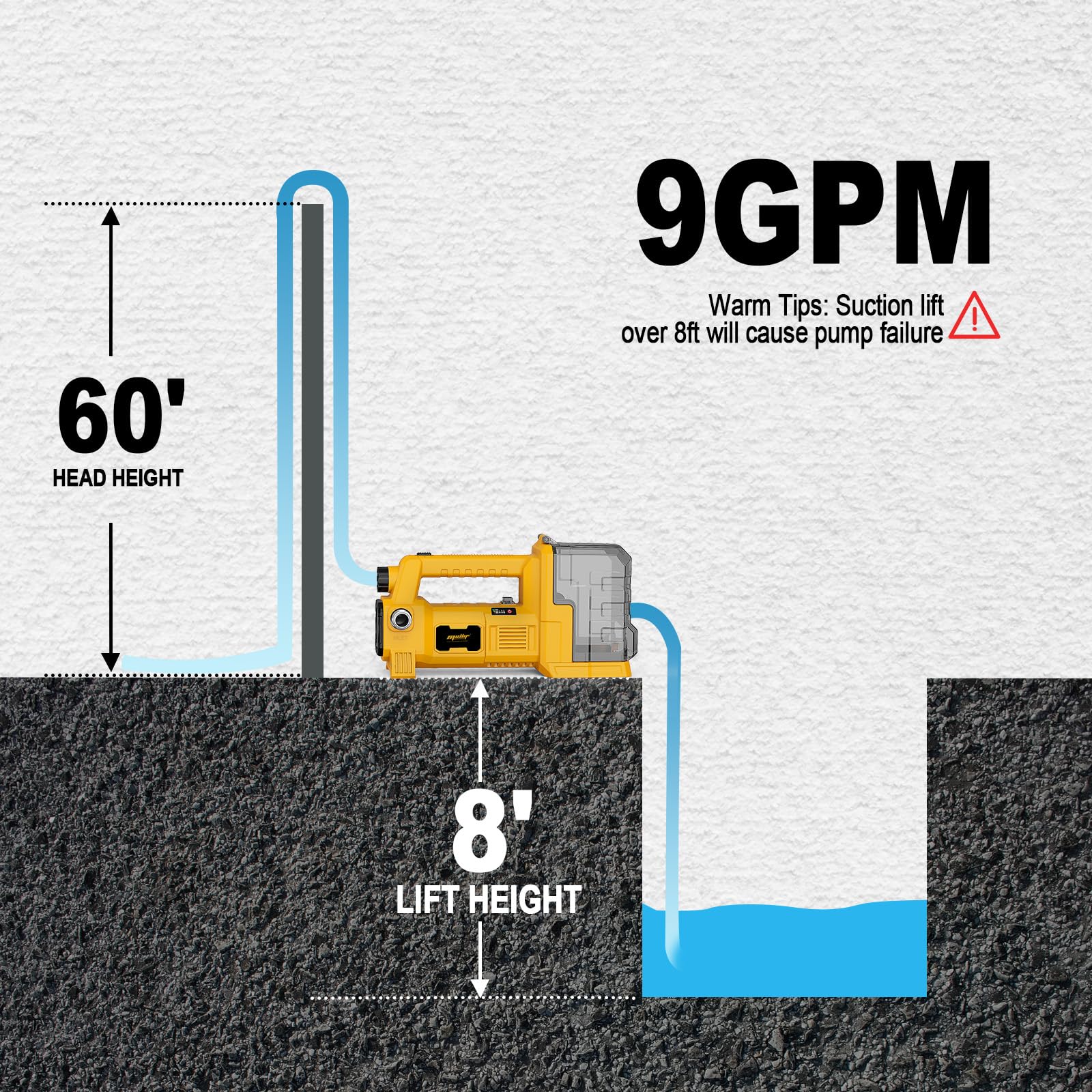 Powerful Brushless Pump: Equipped with a high-efficiency 1/4HP (180W ) brushless motor running at 13,500 RPM for longer service life and outstanding performance. Delivers a maximum flow rate of 9 GPM, with a lift height of up to 8 feet and a head height of up to 60 feet