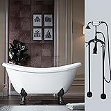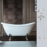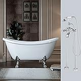 Discover the elegance of tradition with this Woodbridge freestanding bathtub, featuring a polished gold finish and clawfoot design. The heavy-duty acrylic construction guarantees durability, while the double slipper design ensures maximum comfort. The package includes a polished gold drain, overflow, and faucet, providing a complete solution for your bathroom. With dimensions of 60.0L x 40.0W x 30.5H inches and a capacity of 55 gallons, this oblong-shaped bathtub is perfect for a relaxing soak. The product type is BATHTUB, and it is installed in a freestanding manner. The item length, width, and height are 59 inches, 30.2 inches, and 30.5 inches respectively. Experience the luxury of a Woodbridge bathtub, backed by the brand's commitment to quality.