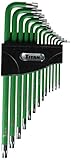 Titan 12736 9-Piece Metric Ball End Hex Key Set includes 1.5, 2, 2.5, 3, 4, 5, 6, 8, and 10mm ball end hex keys. Hex keys are constructed of durable, high-quality S2 steel. Ball end design allows up to a 25-degree angle of entry for faster insertion and removal of screws. Sizes are laser etched onto color-coded L-keys for quick and easy identification and set includes a plastic organizer with size markings. Made in Taiwan.
