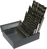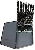 Drill America Qualtech 115 piece 135 degrees split point heavy duty drill bit set comes in a metal case. Manufactured to National Aerospace standard 907. Made of heat resistant cobalt, they display higher red hardness which permits speeds upto 30 percent greater than High-Speed Steel drills and are especially effective in drilling tough, high tensile strength materials like PH stainless steel, inconel, and titanium. These drills are self-centering and reduces thrust. Sizes smaller than 1/16-inches have the 118 degrees standard point. Cobalt steel tools are similar to high-speed steel, but with more cobalt for improved performance when cutting harder metals such as stainless steel or nickel alloys. Gold oxide is a thinner oxide surface treatment than black oxide typically used to identify cobalt steel tools; performance is similar to uncoated tools. Round shanks allow use with a wide variety of toolholding systems. When run in a counterclockwise direction (right-hand cut) spiral fluted tools evacuate chips up and out of the cut to reduce clogging. Set includes combination of fraction, letter, and wire sizes: 1/16" to 1/2" (1/64 Increments); A to Z; # 1 to # 60.