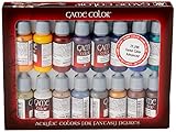 The set consists of 16 bottles of 18 ml (0.60 fl.oz.) with eyedropper and contains the following colors: 72.001 Dead White - 72.034 Bone White - 72.006 Sun Yellow - 72.008 Orange Fire - 72.010 Bloody Red - 72.022 Ultramarine Blue - 72.030 Goblin Green - 72.028 Dark Green - 72.036 Bronze Brown - 72.040 Leather Brown - 72.043 Beasty Brown - 72.049 Stonewall Grey - 72.051 Black - 72.052 Silver - 72.054 Dark Gunmetal - 72.055 Polished Gold